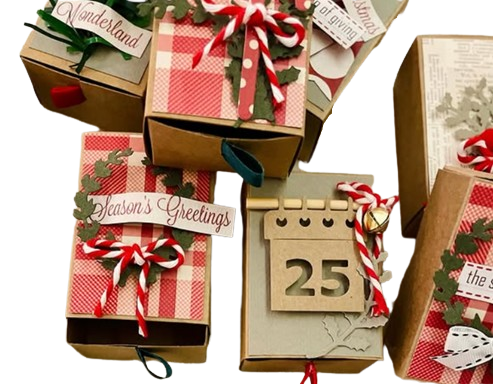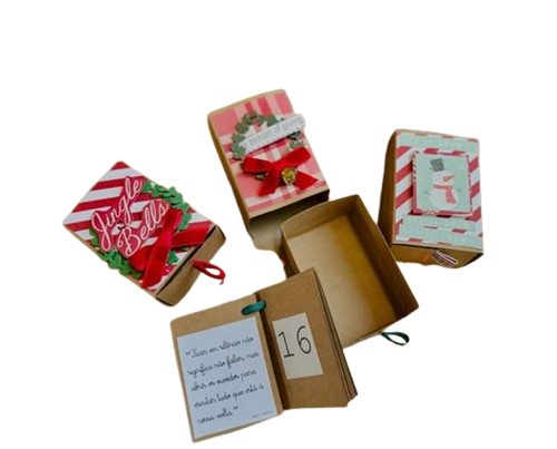Calendário do Advento com mensagens motivacionais em cada um dos primeiros 25 dias de Dezembro. Tamanho caixa de fósforos com capas alusivas ao Natal.